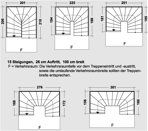 Halbgewendelte Treppengrundrisse (4) mit angrenzendem Verkehrsraum (Standardbeispiele)
